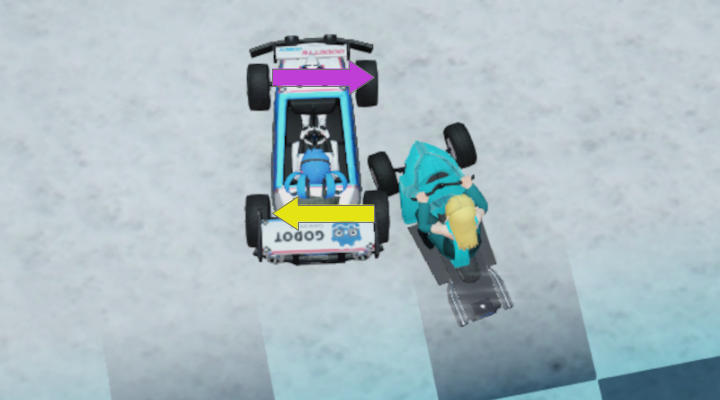 | The arrows show the rotational forces the pushed kart is subject to without the impulse separating the karts. |